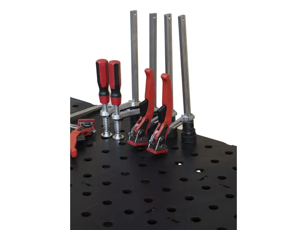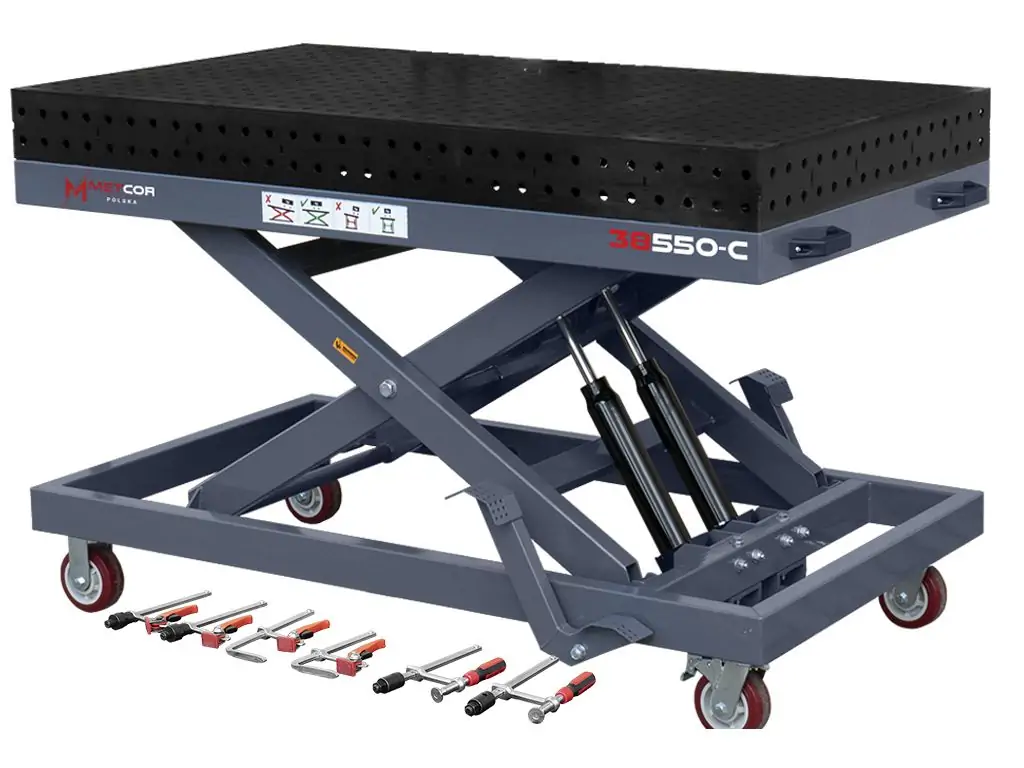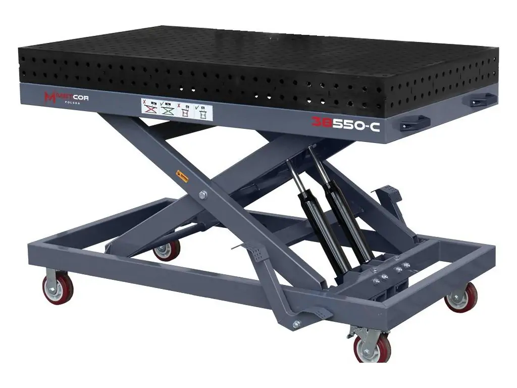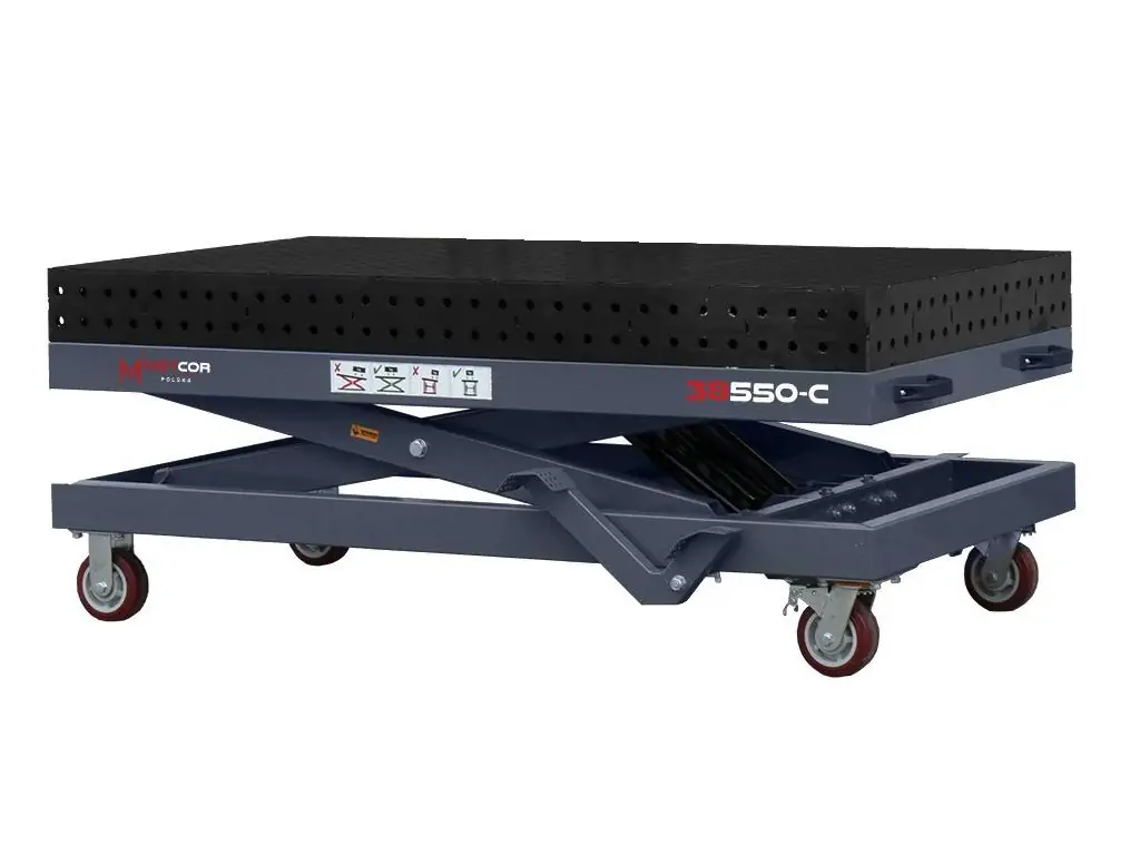 Гідравлічна система підйому ножичного типу дає змогу плавно регулювати висоту в діапазоні 470-1075 мм. По всій поверхні столу розташовані отвори діаметром 16 мм (стандарт D16), кожен з яких має фаску для легкого встановлення оснастки. Отвори на бічних стінках дозволяють закріпити деталь перпендикулярно до основної робочої поверхні, що перетворює цей регульований зварювальний стіл на повноцінну 3D-систему позиціювання. Посилені, поворотні на 360° колеса дозволяють легко переміщати стіл по робочій зоні або повертати його навколо своєї осі для зручного доступу до заготовки.